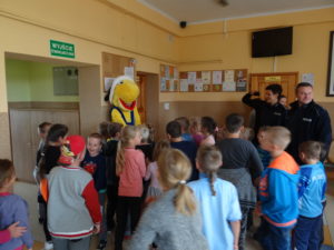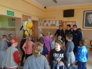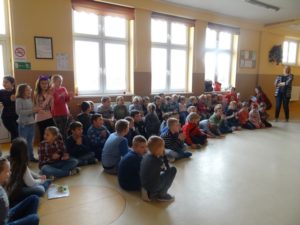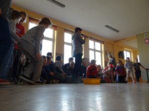Zbiórka – „Mleko dla Aleppo” – losowanie na zdjęciu uczniowie i uczennice, pan Kamil, pani Kasia oraz w tle pan Dyrektor Marek Skwarski