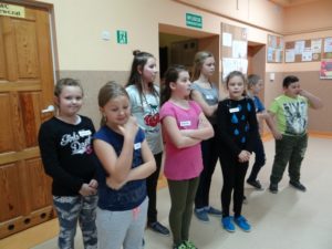 Zajęcia z W-F w czasie zimy listopad i grudzień 2016 – zdj. z p. Danusią: Dominika, Kinga, Hubert, Tobiasz
