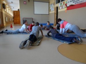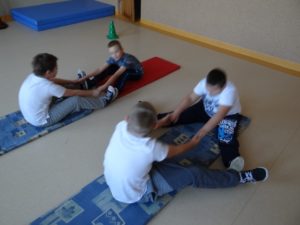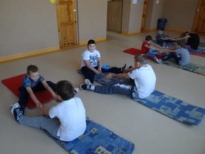 Zajęcia z W-F w czasie zimy listopad i grudzień 2016 – od lewej Paweł, Rafał, Maja