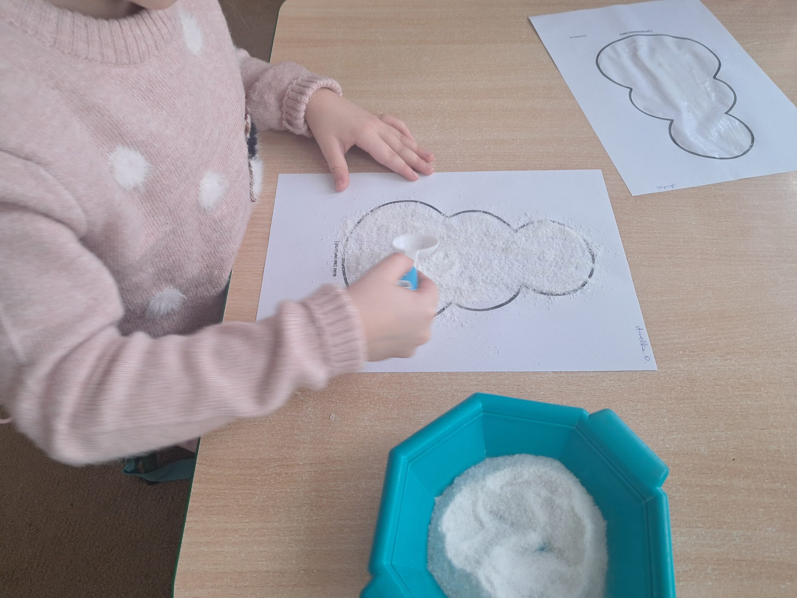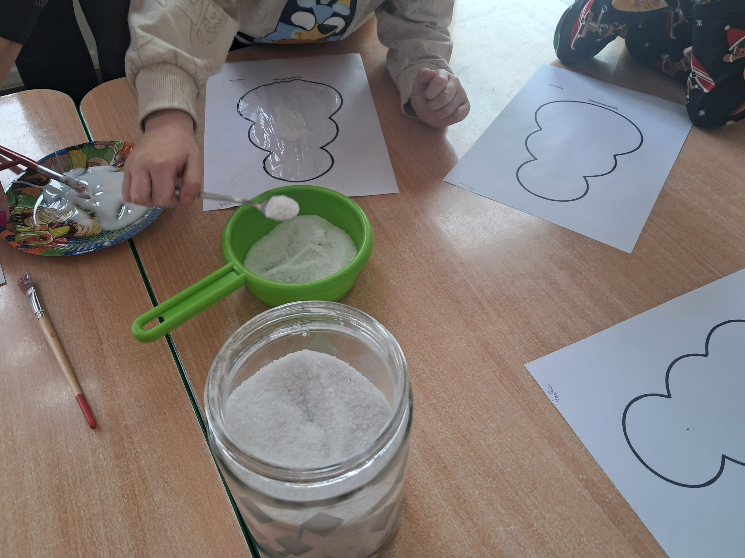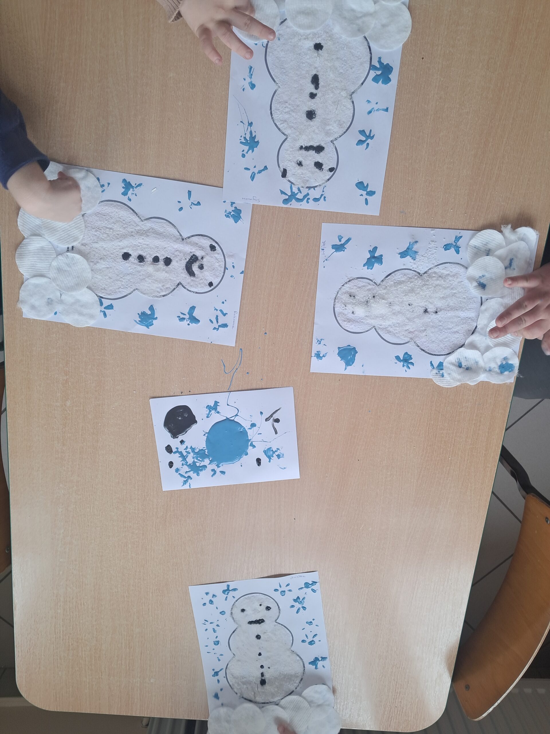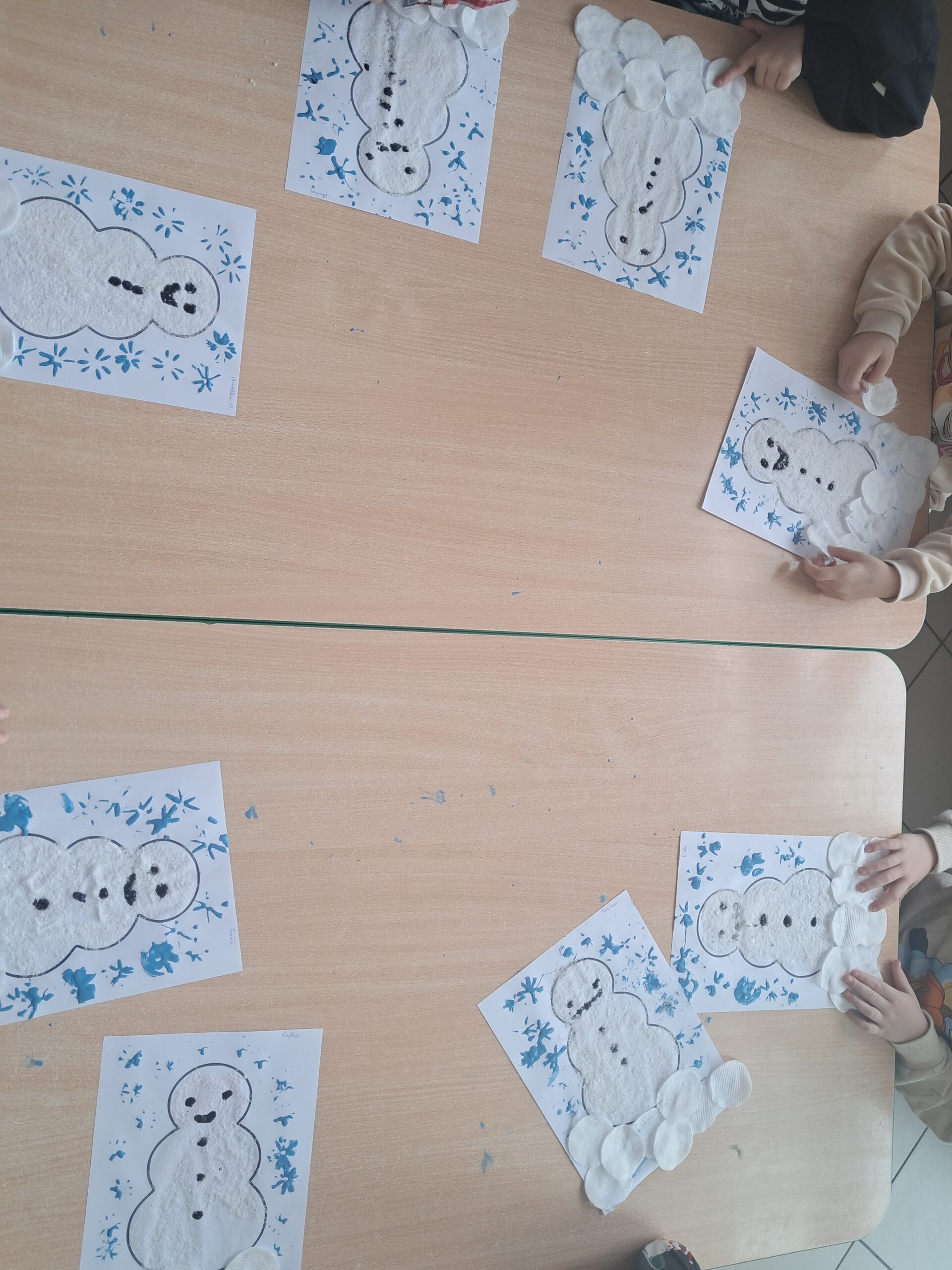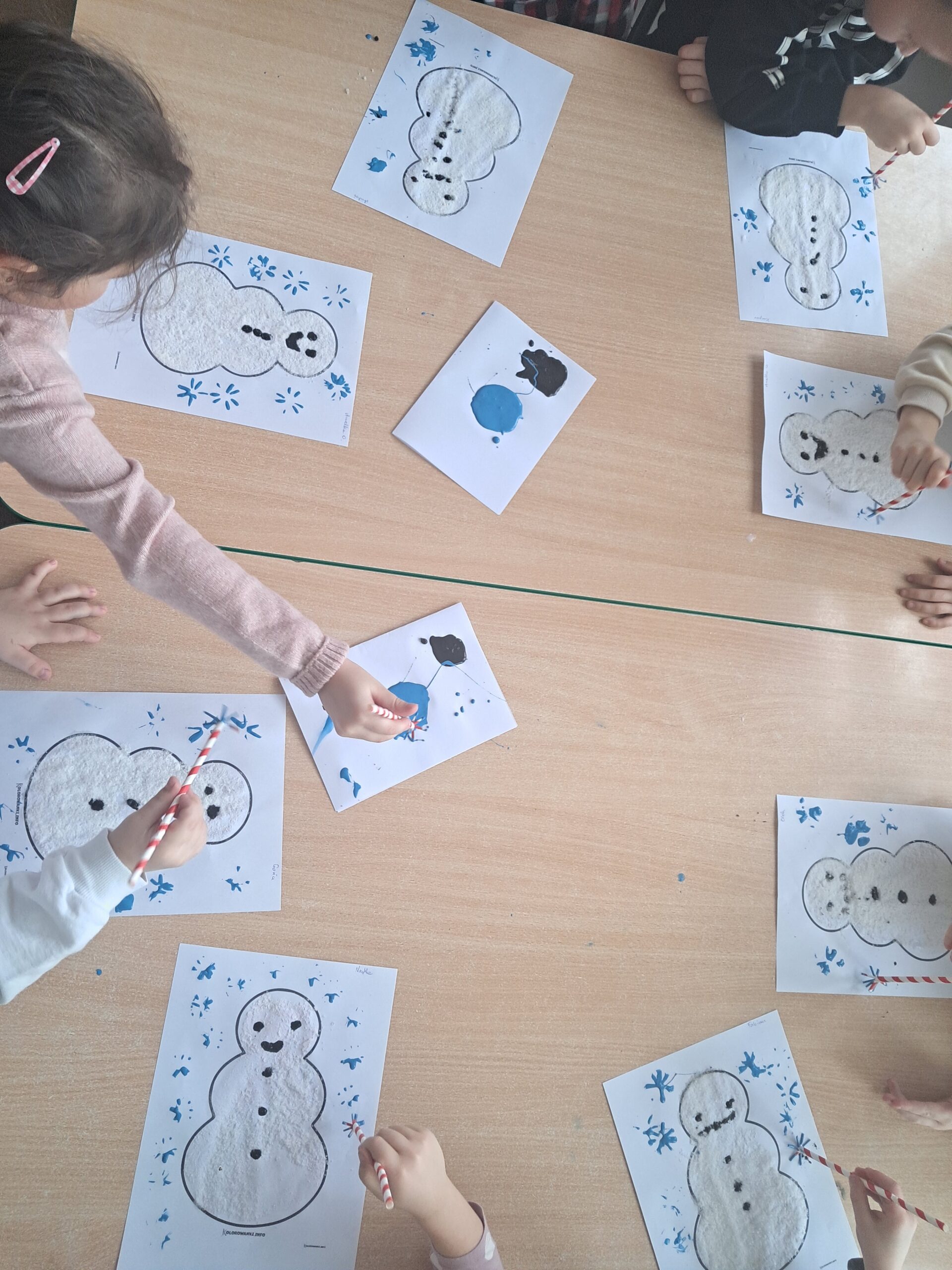 Podczas zajęć dzieci z dużym zaangażowaniem tworzyły swoje bałwanki. Najpierw sylwetkę bałwanka posmarowały klejem, a następnie posypały ją grubą warstwą soli, dzięki czemu praca nabrała ciekawej, zimowej faktury. Dół kartki ozdobiły płatkami kosmetycznymi, imitującymi śnieg. Oczy, buzię oraz guziki wykonały z czarnej farby plakatowej przy użyciu patyczków. Słomką zrobiły niebieskie płatki śniegu.